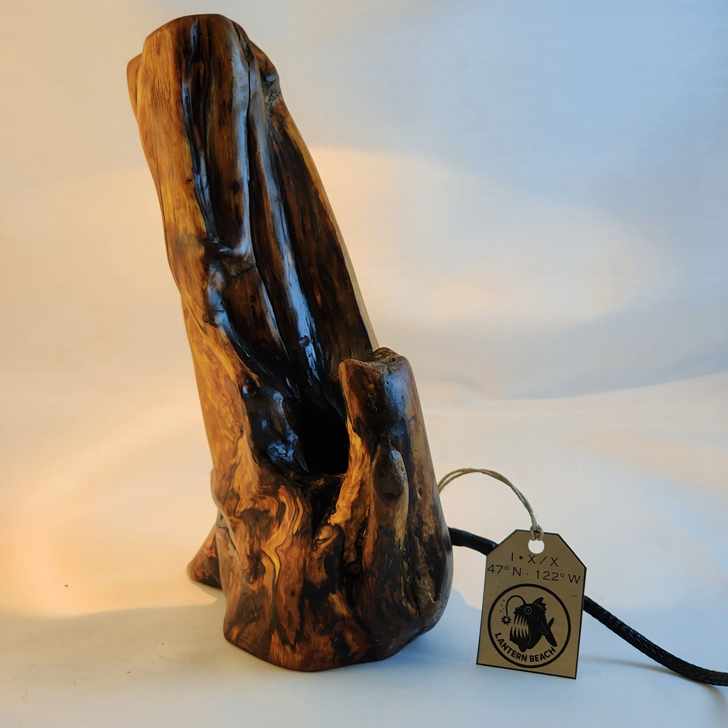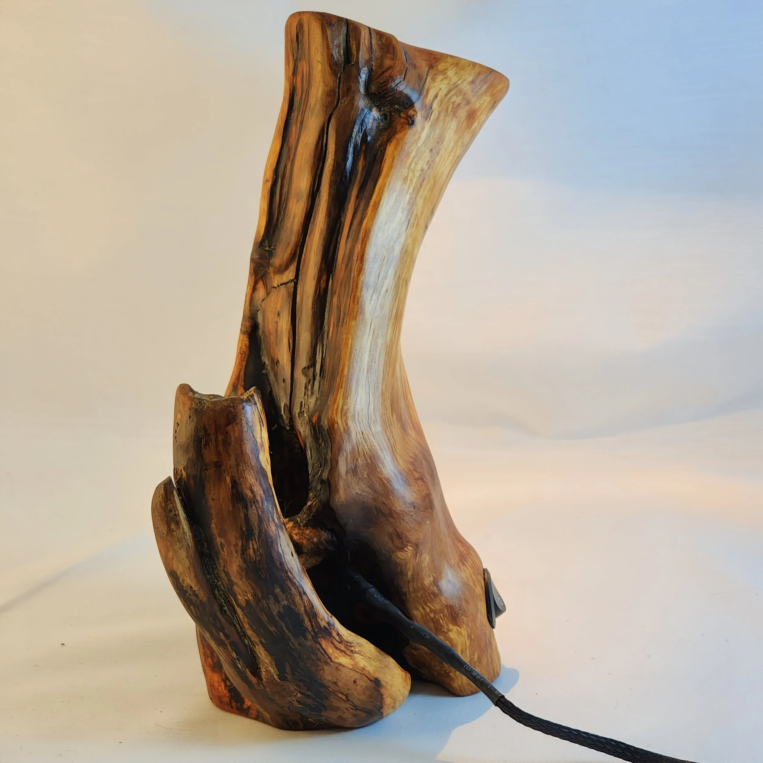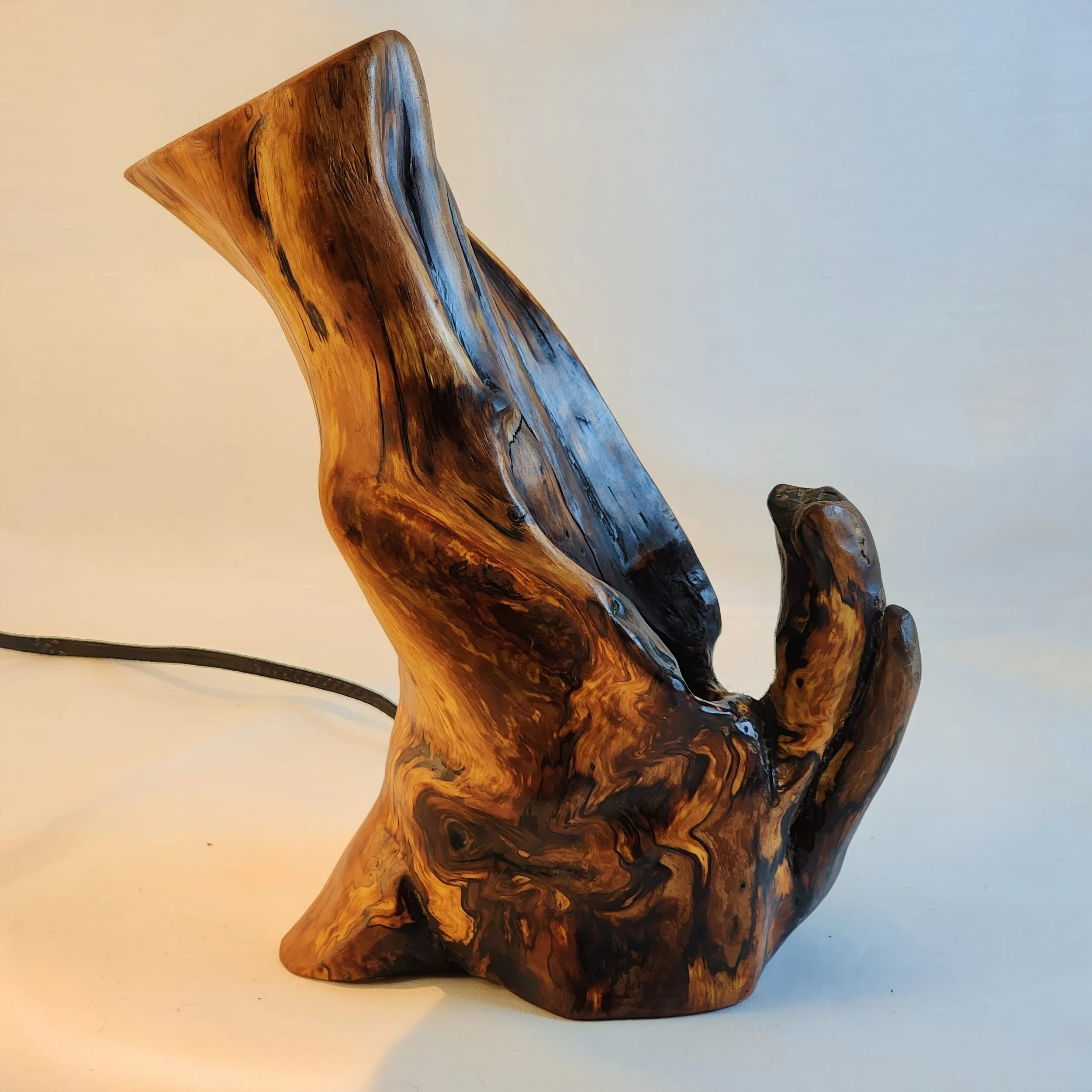 One side shows modest, uniform grain. The other is stunning: dark swirls and rich, mixed colors that only emerged after finishing. The piece also has a natural simplicity to it. The wood's shape creates a built-in hood that feels intentional, like it was always meant to be a desk lamp rather than something I forced into being.
