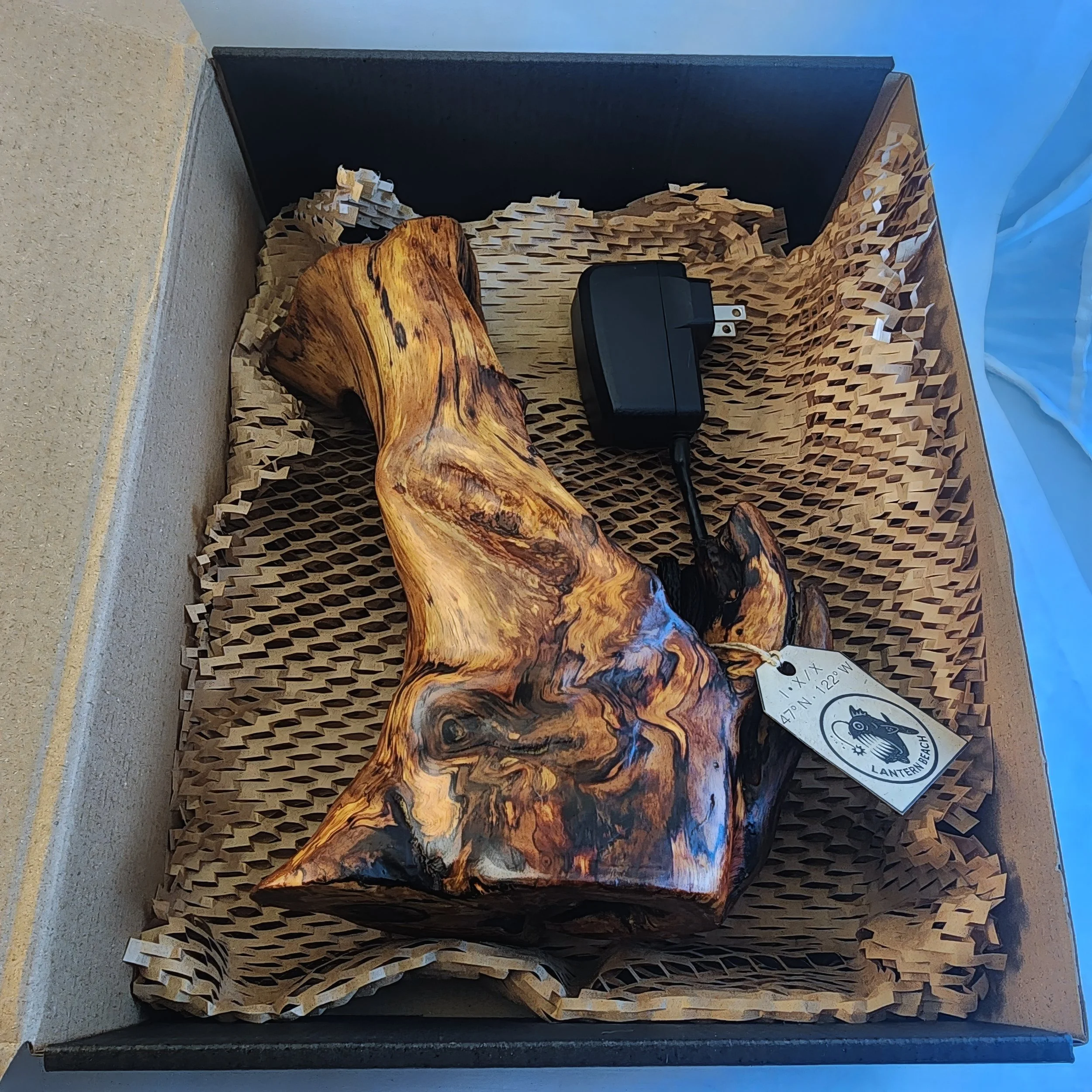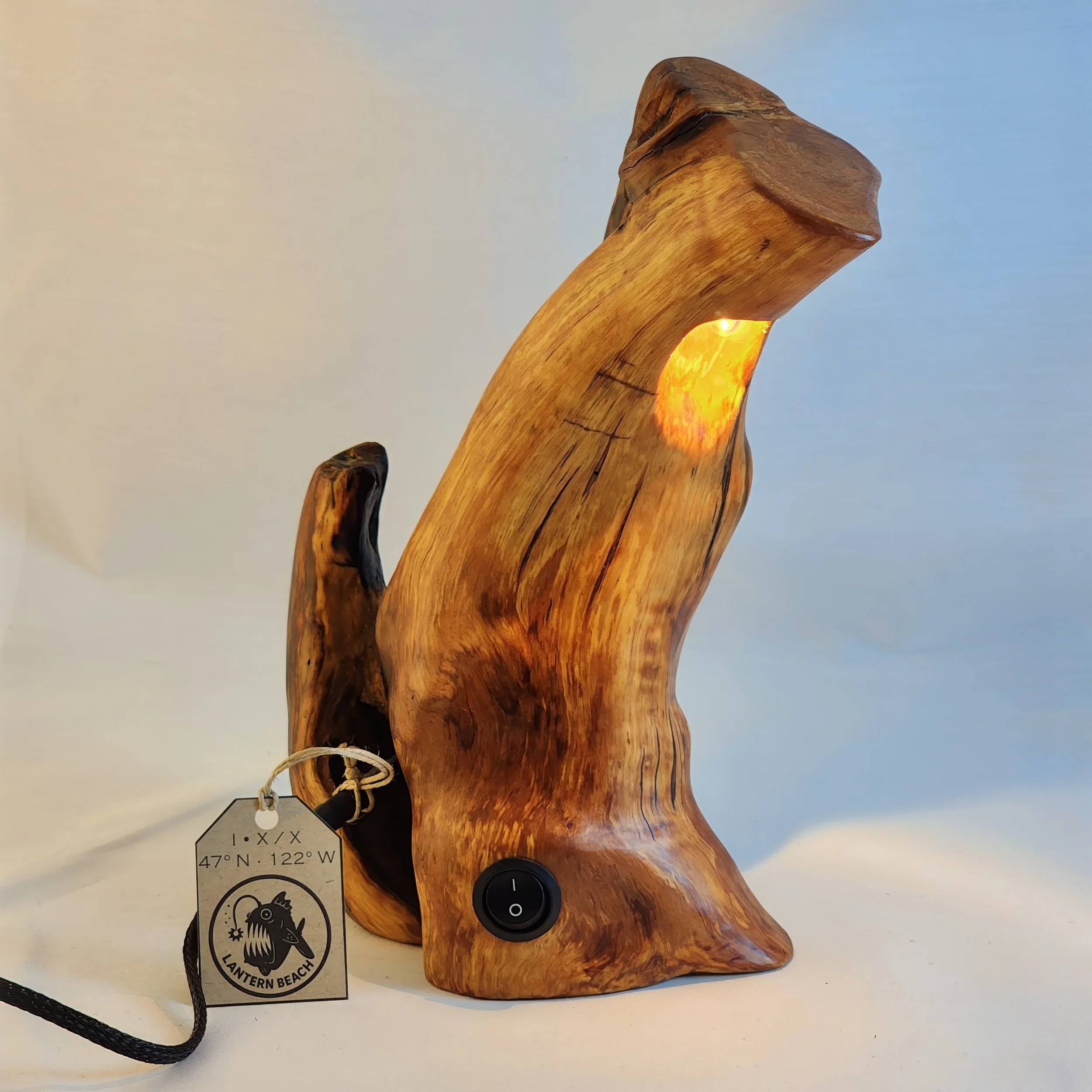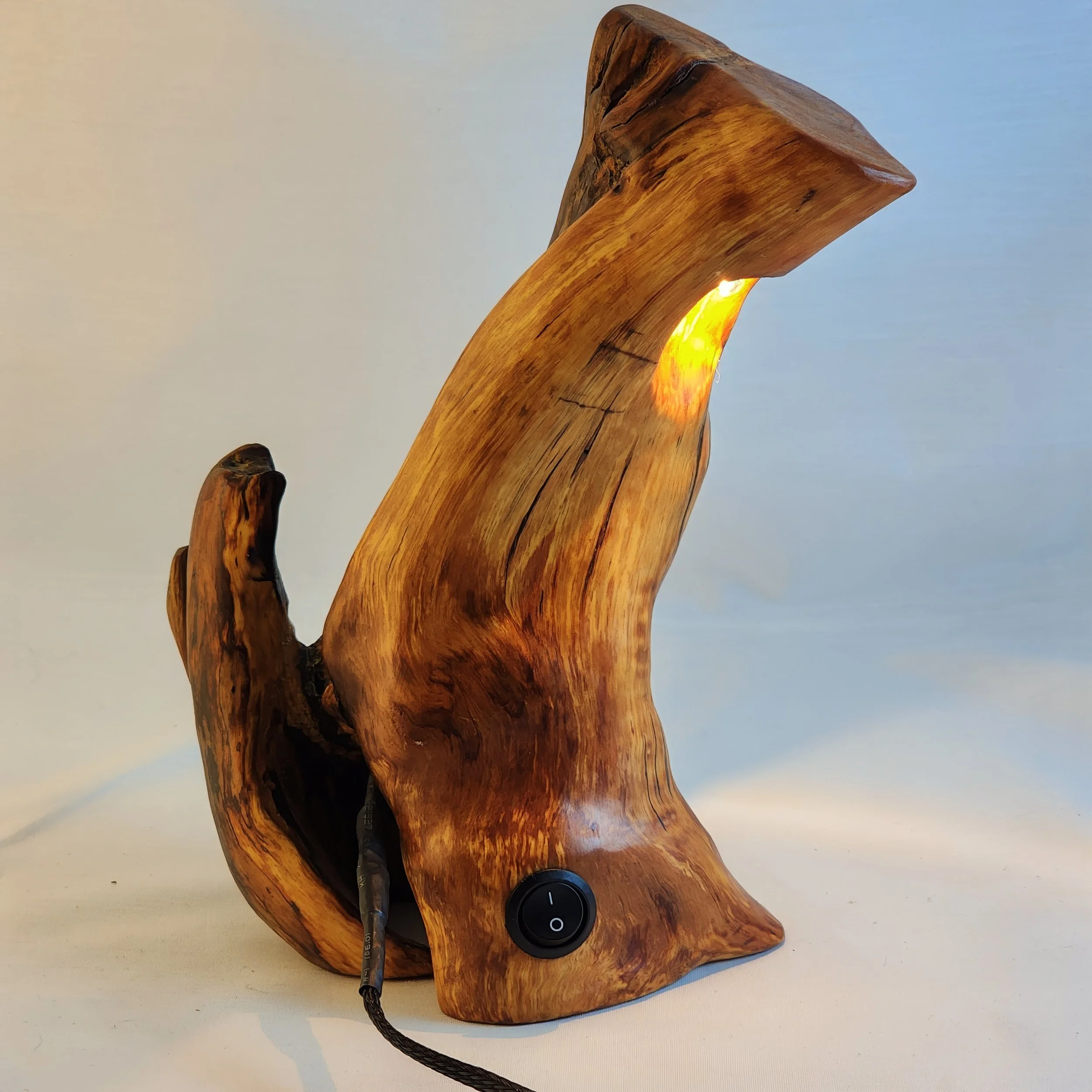 One side shows modest, uniform grain. The other is stunning: dark swirls and rich, mixed colors that only emerged after finishing. The piece also has a natural simplicity to it. The wood's shape creates a built-in hood that feels intentional, like it was always meant to be a desk lamp rather than something I forced into being.